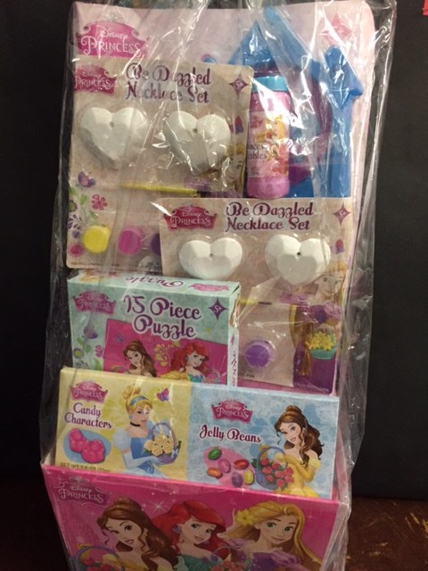 Disney Princess basket, includes candy, puzzle, painting crafts (2), and bubbles.