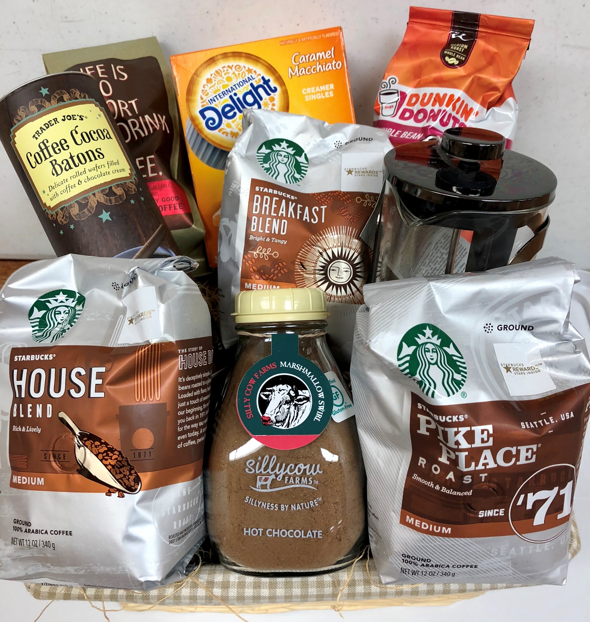 Starbucks Coffee (3), Dunkin Donuts Coffee, NY Coffee, Creamers, Hot Chocolate, Batons, French Press